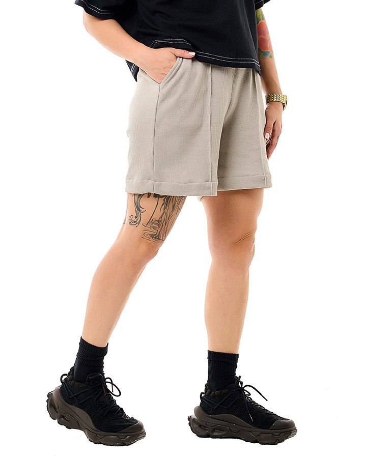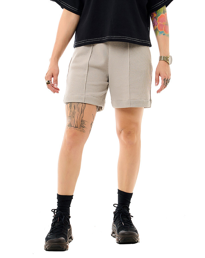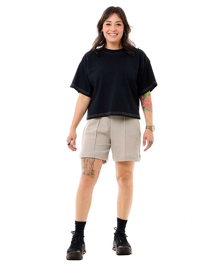 A Bermuda Casual Feminina Malha Textura Square Nervura Knulu é a escolha perfeita para quem busca um visual moderno e sofisticado sem abrir mão do conforto. Confeccionada em malha de alta qualidade com 50% algodão e 50% poliéster, seu tecido texturizado com leve padrão canelado adiciona um toque elegante e diferenciado à peça.