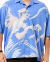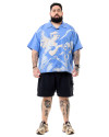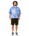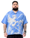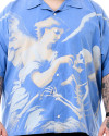Com um corte oversized, essa camisa apresenta um caimento solto e moderno, mangas curtas amplas e uma gola cubana que adiciona um toque retrô ao visual. A estampa artística em tons suaves de branco e bege retrata um anjo sereno interagindo com um esqueleto, simbolizando o contraste entre vida e morte. Esse detalhe marcante contrasta elegantemente com o tecido azul jeans, criando um visual sofisticado e cheio de personalidade.