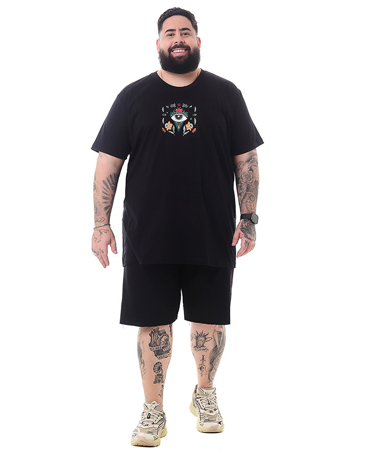 O grande destaque vai para a estampa frontal: um olho estilizado cercado por elementos geométricos e florais em tons vibrantes de verde, laranja e vermelho. Essa combinação de cores e formas cria uma atmosfera única, perfeita para quem quer expressar sua identidade com um toque de arte e simbologia.