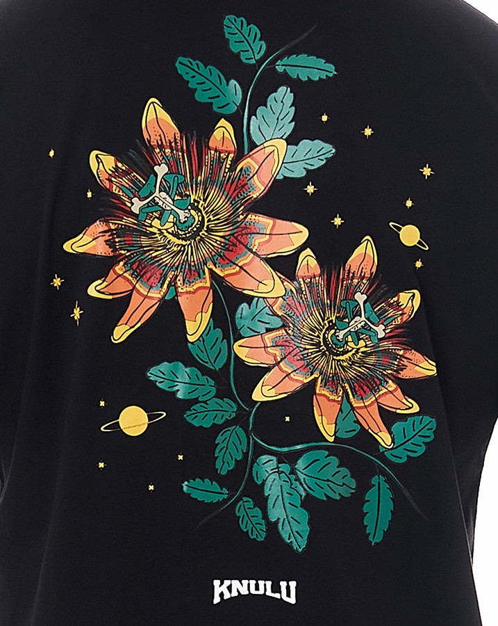 Com seu corte tradicional, gola careca e mangas curtas, a camiseta oferece um ajuste clássico e versátil. Na frente, ela traz uma pequena estampa com a logo da Knulu, adicionando um toque de autenticidade ao seu visual. Porém, o destaque está na parte traseira, onde uma bela estampa de duas flores em tons de amarelo e laranja, com um ramo de folhas, estrelas e um planeta, oferece um toque único e artístico à peça.