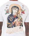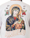 Na parte de trás, a Camiseta Classic Perpétuo Knulu se transforma em uma verdadeira obra de arte. Um silk grande da nossa senhora do perpétuo socorro, com dois anjos a rodeando, é o destaque. Abaixo, a logo da Knulu completa essa composição única.