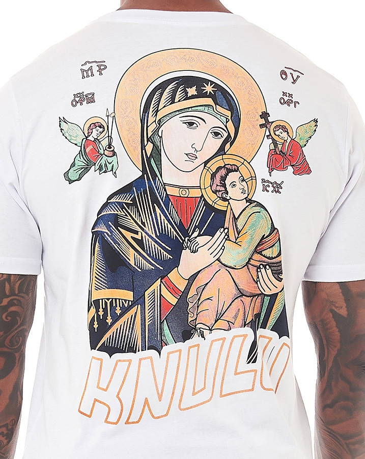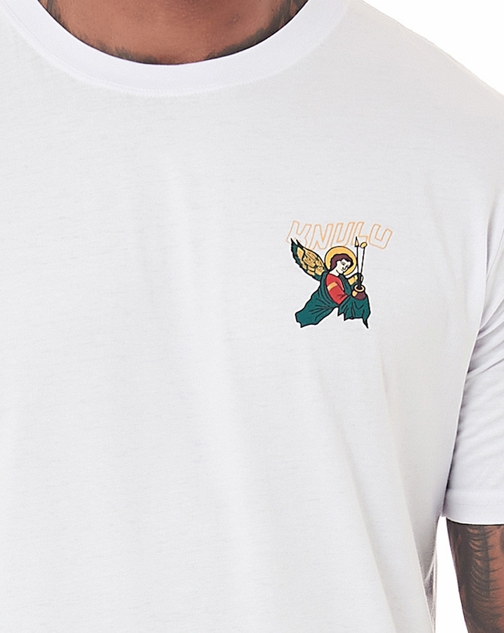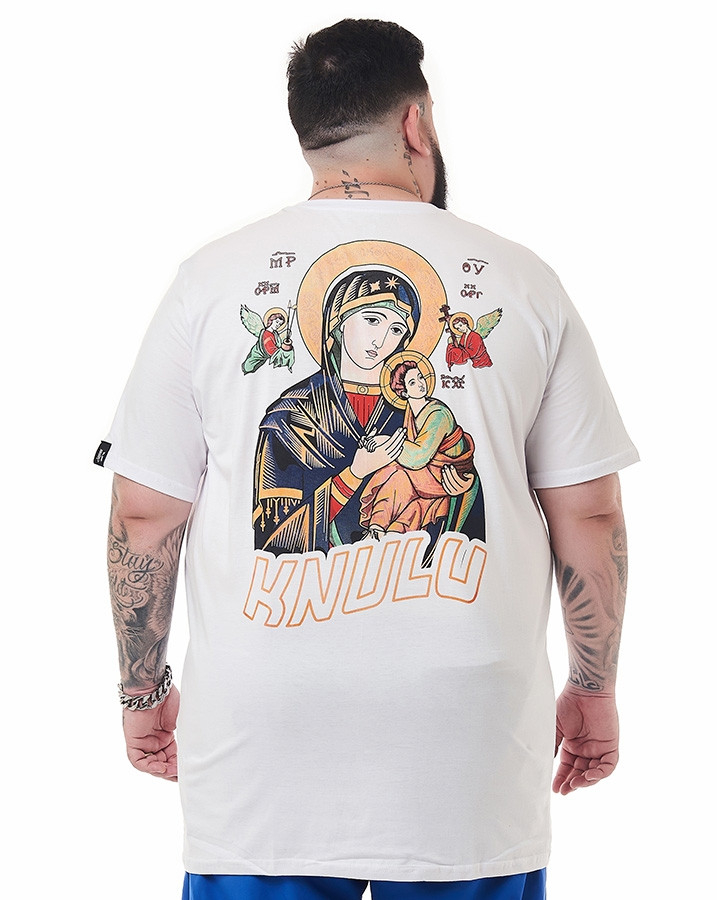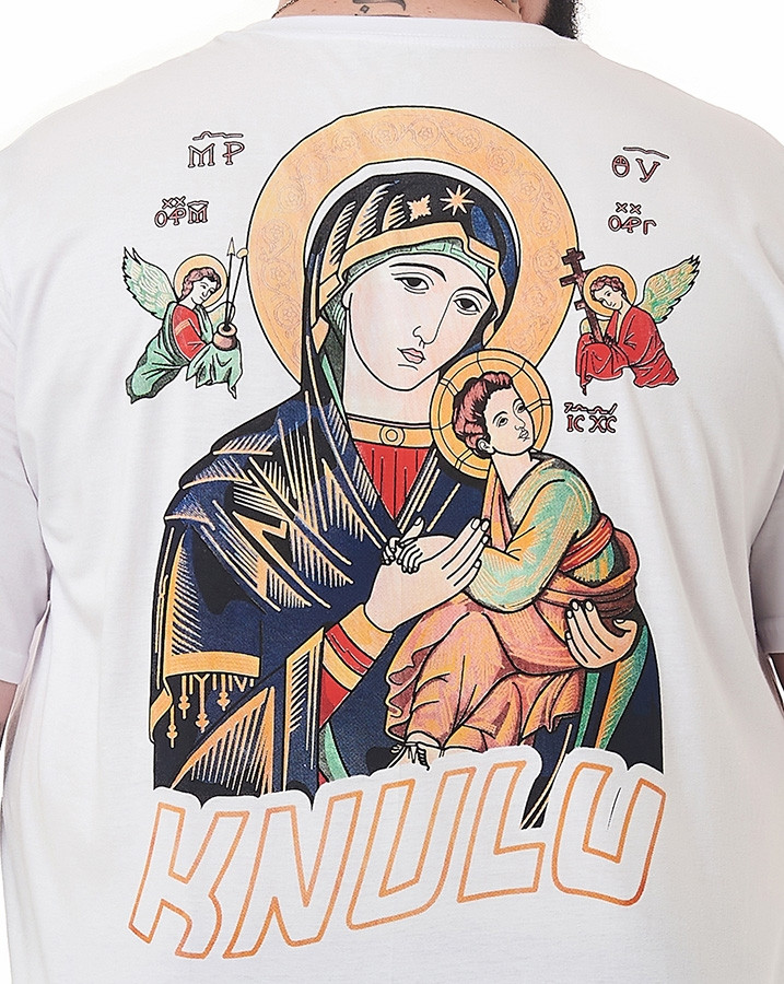 A parte frontal desta camiseta traz uma estampa discreta, localizada no lado esquerdo do peito, com a palavra "Knulu" acompanhada por uma pequena imagem de nossa senhora do perpétuo socorro. Uma forma sutil de carregar sua fé consigo, sempre perto do coração.