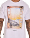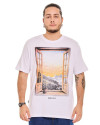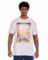 Produzida em algodão de toque macio e caimento leve, valoriza o bem-estar no uso cotidiano. A estampa em silk screen com a imagem de uma janela aberta para a natureza cria um contraste marcante, evocando sensações de liberdade e tranquilidade. A assinatura da marca logo abaixo reforça a identidade visual sem excessos.