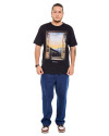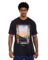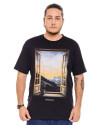 Produzida em algodão de toque macio e caimento leve, valoriza o bem-estar no uso cotidiano. A estampa em silk screen com a imagem de uma janela aberta para a natureza cria um contraste marcante, evocando sensações de liberdade e tranquilidade. A assinatura da marca logo abaixo reforça a identidade visual sem excessos.