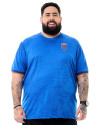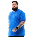 A modelagem regular, com caimento reto, garante uma estrutura equilibrada no corpo. A gola redonda, em ribana elástica azul com acabamento canelado, oferece um toque de autenticidade, enquanto as mangas curtas, com acabamento em ribana azul e faixa laranja contrastante, adicionam um detalhe moderno e dinâmico à peça.