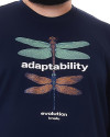 A estampa em silk screen é um destaque à parte. Com a palavra "Adaptability" e duas libélulas em tons vibrantes de laranja e verde, seguida da palavra "evolution" e do delicado logo "knulu", essa camiseta não só veste bem como transmite uma mensagem de evolução e adaptação.