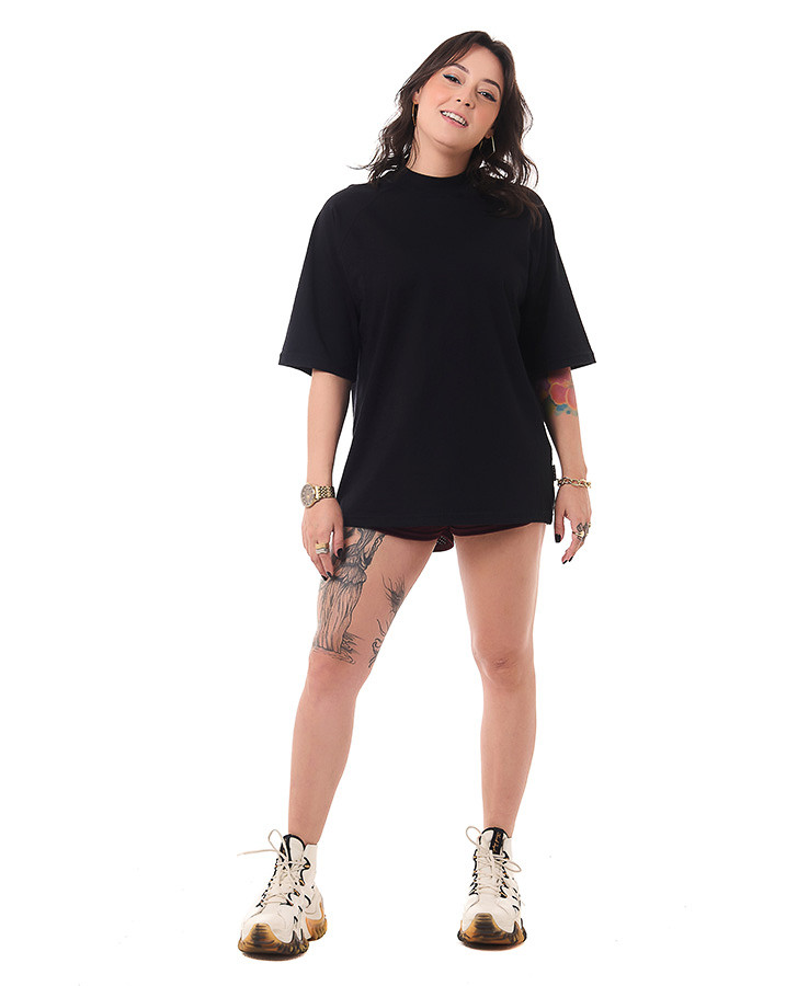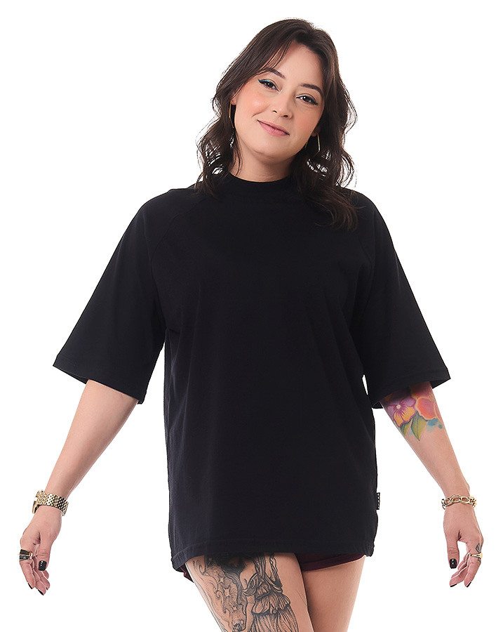 O corte oversized e a manga raglan proporciona um caimento moderno e descolado, garantindo liberdade de movimento e um visual urbano único. Além disso, o destaque fica por conta da gola alta, que confere um toque de sofisticação e personalidade à camiseta.