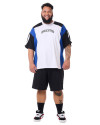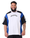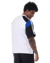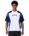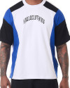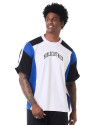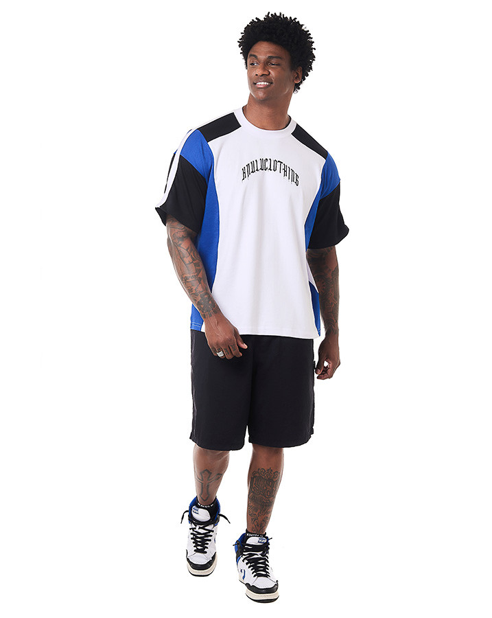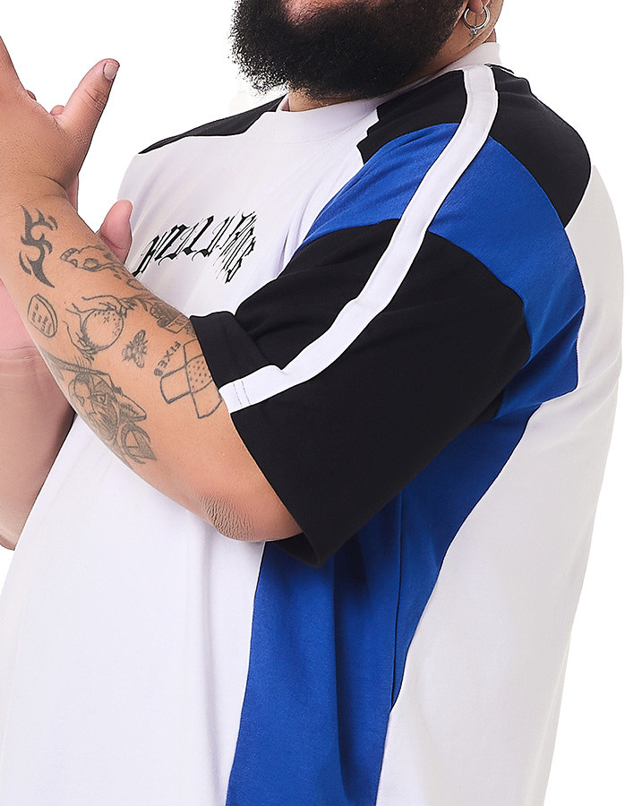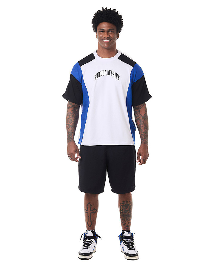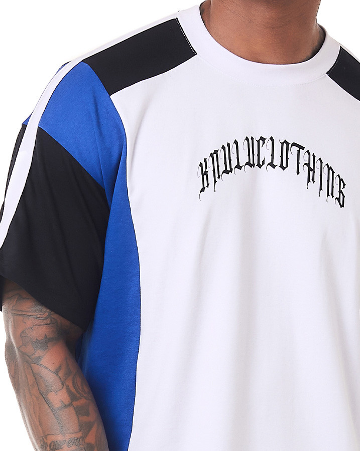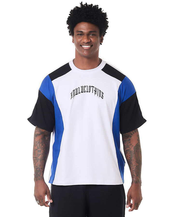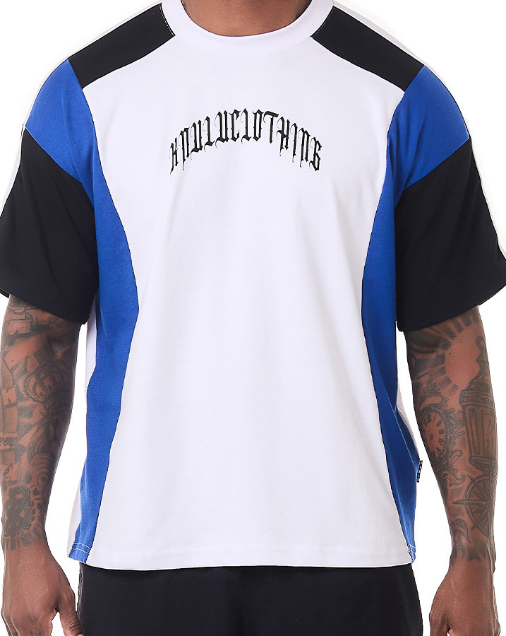 O que faz essa camiseta se destacar são os recortes únicos: corpo, gola e viés sobre a manga em branco, recortes na manga e na lateral em azul, e início da manga e ombro em preto. Cada detalhe foi pensado para criar um contraste visual incrível. A estampa em estilo gótico escrito "Knulu clothing" na frente adiciona aquele toque de atitude.