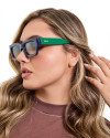 Com design imponente e toque retrô, o Óculos De Sol Retangular Fade Retro Knulu aposta no contraste marcante para trazer mais personalidade ao visual. A combinação do azul marinho com verde vibrante cria um efeito bicolor moderno e ousado, enquanto o formato retangular reforça a estética vintage inspirada nos anos 2000. Fabricado em acetato premium com acabamento brilhante, oferece estrutura firme e confortável no uso diário. As lentes com proteção UV400 garantem segurança para os olhos em ambientes externos, bloqueando raios UVA e UVB com eficiência.