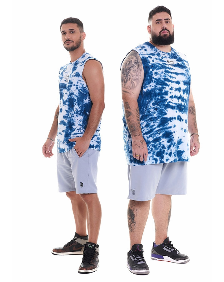 A Regata Masculina Machão Tie-Dye Storm Azul Knulu foi produzida em malha premium, sendo pensada desde o início do processo dos fios de alta qualidade, modelagem clássica, gola careca e mangas curtas.