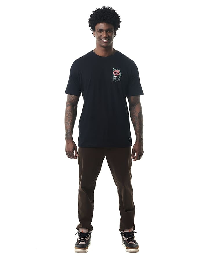 A estampa traz uma flor vibrante sobre uma caveira, criando um visual de impacto com apelo artístico e simbólico. A composição gráfica se destaca nas costas da peça e se repete em menor escala na frente, equilibrando presença visual e estilo. Conta ainda com pequena etiqueta aplicada na lateral, reforçando o acabamento autêntico da marca.