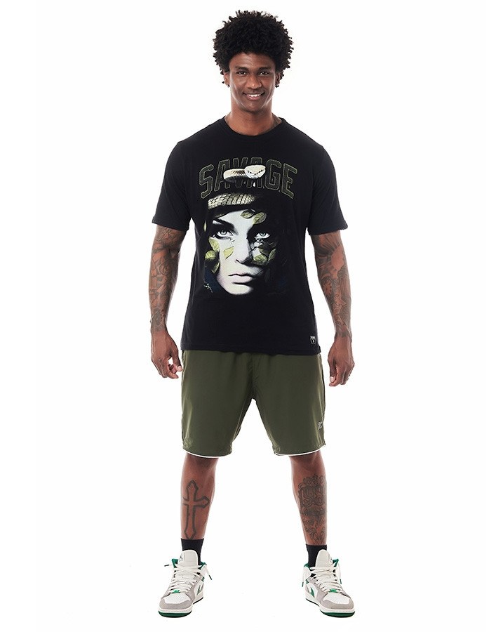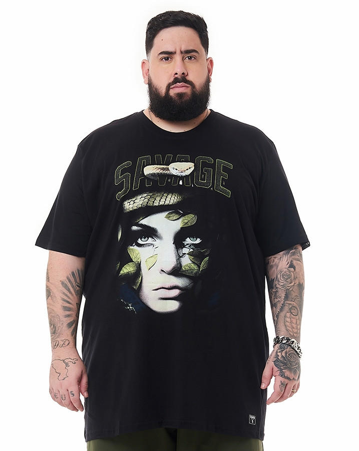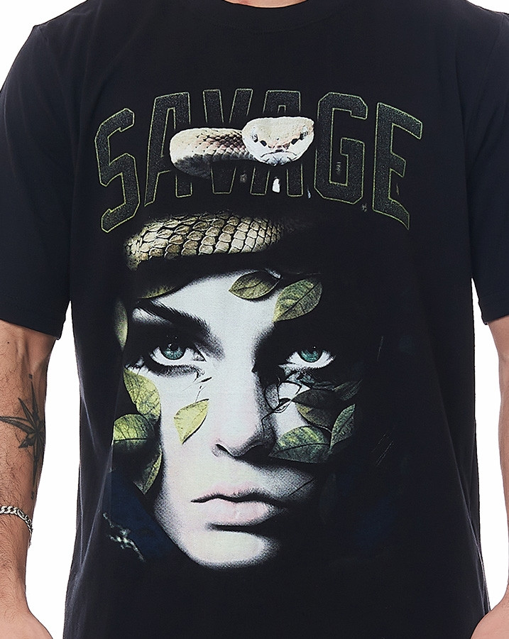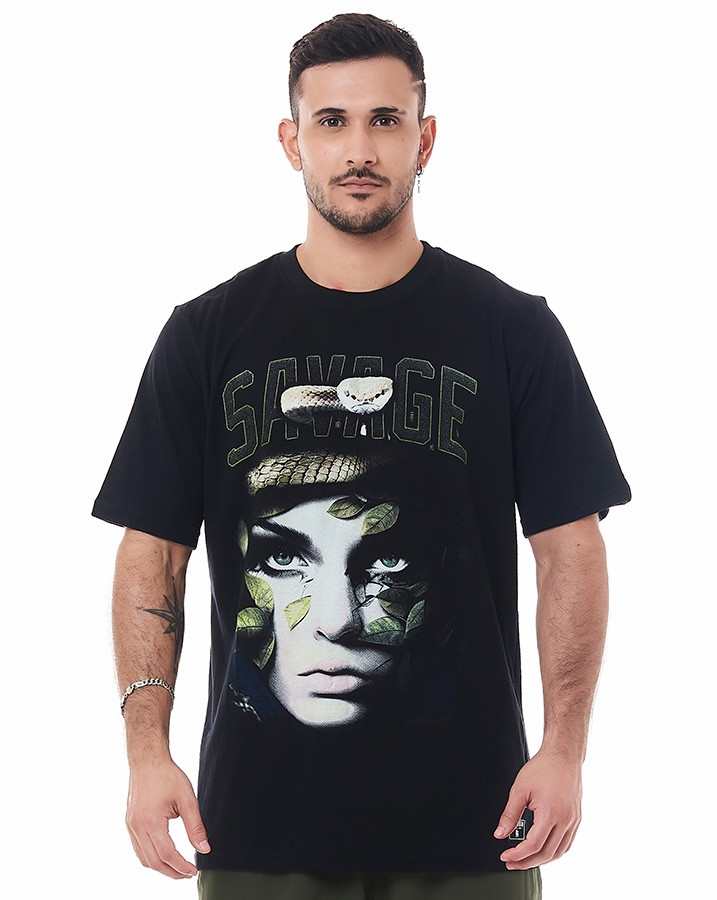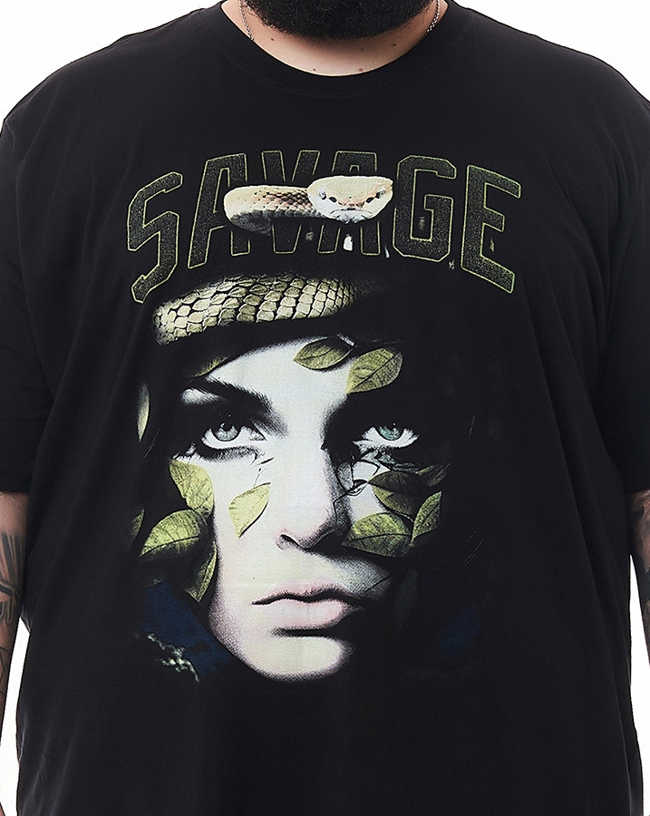 Seu corte tradicional proporciona um caimento perfeito, enquanto a gola careca e a manga curta tradicional conferem a versatilidade necessária para se destacar em diversas ocasiões. O que torna esta camiseta verdadeiramente única é o seu silk frontal, apresentando uma montagem impressionante com um rosto feminino, uma cobra, folhas e a palavra "savage" em destaque.