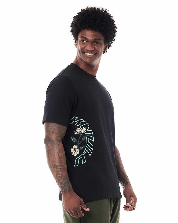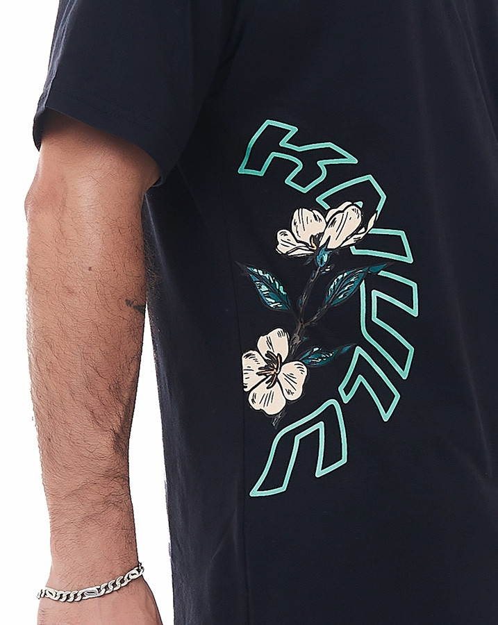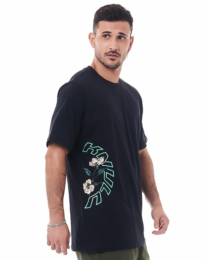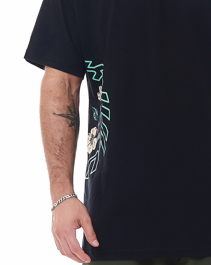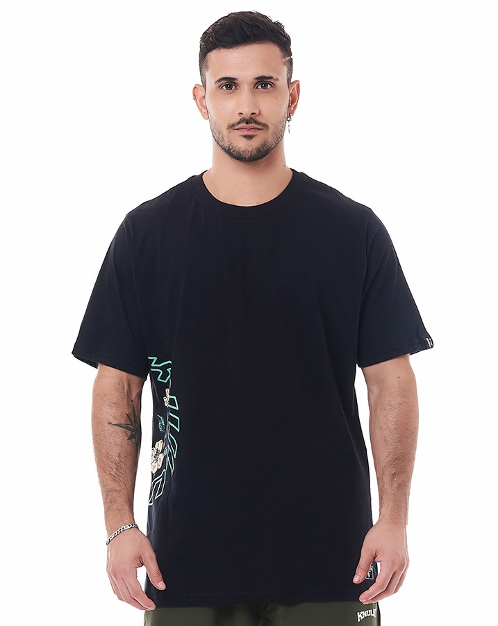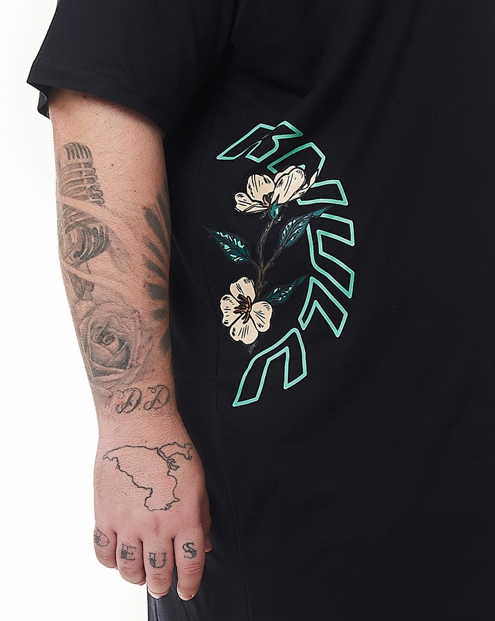 Na parte frontal da camiseta, uma estampa localizada abaixo do braço esquerdo combina flores delicadas e a logo da Knulu em um arco elegante. Essa composição cria um visual único e sofisticado, tornando a peça perfeita para diversas ocasiões.