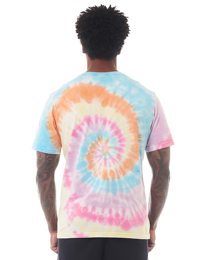 A produção artesanal de tingimento tie-dye em padrão espiral, com cores vibrantes como azul, laranja, amarelo, rosa e branco, confere a cada peça uma singularidade única.