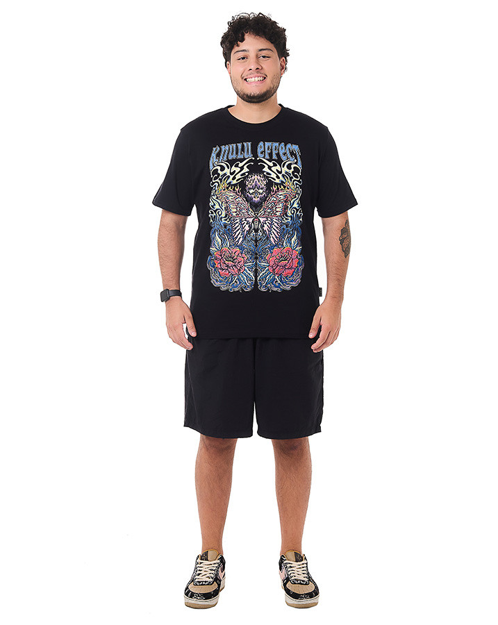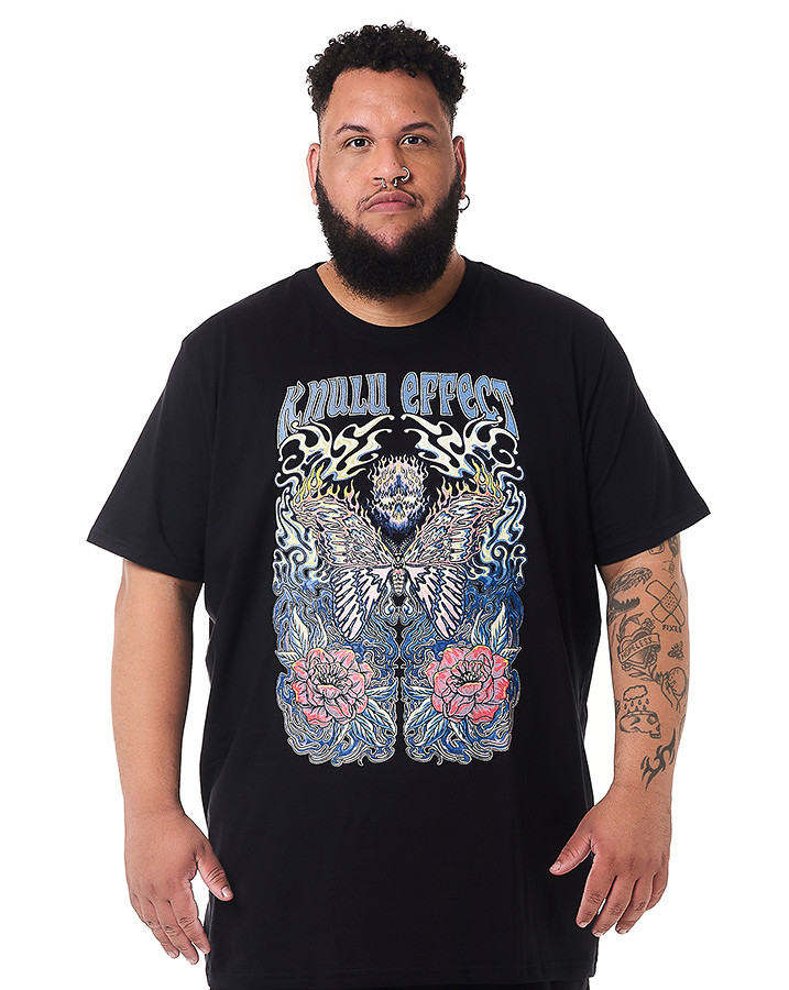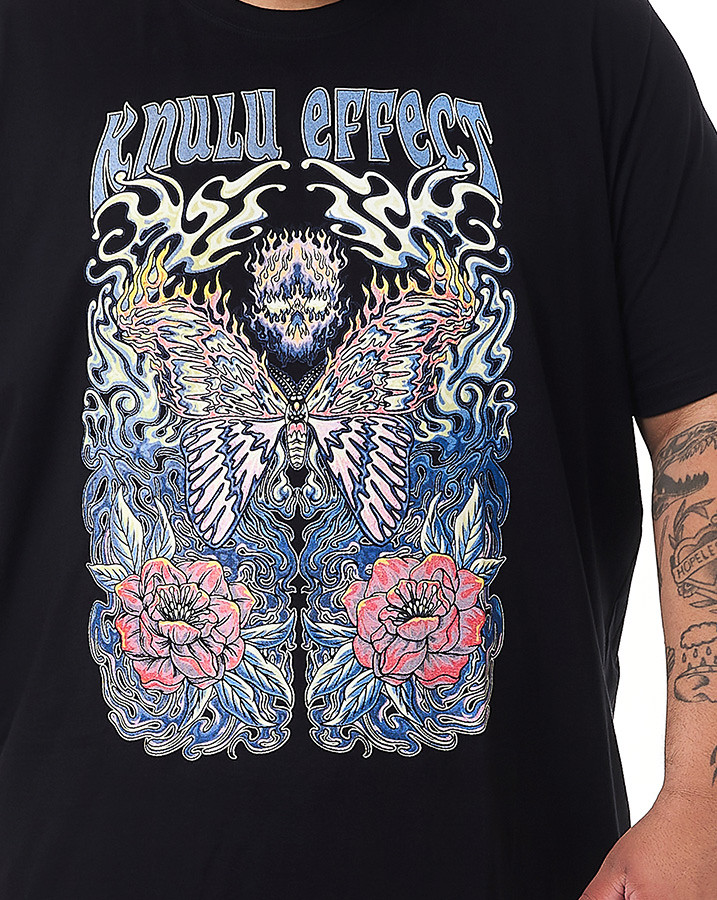 Feita com malha 100% algodão de alta qualidade, esta camiseta oferece conforto incomparável e durabilidade para acompanhar você em todas as ocasiões. O destaque fica por conta da estampa em silk screen na frente, que apresenta o logo "Knulu Effect" acompanhado por uma borboleta, duas rosas e detalhes em volta, adicionando um toque de originalidade ao seu look.