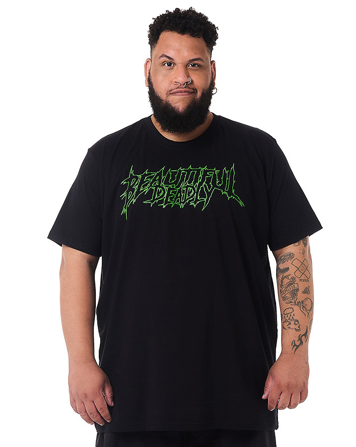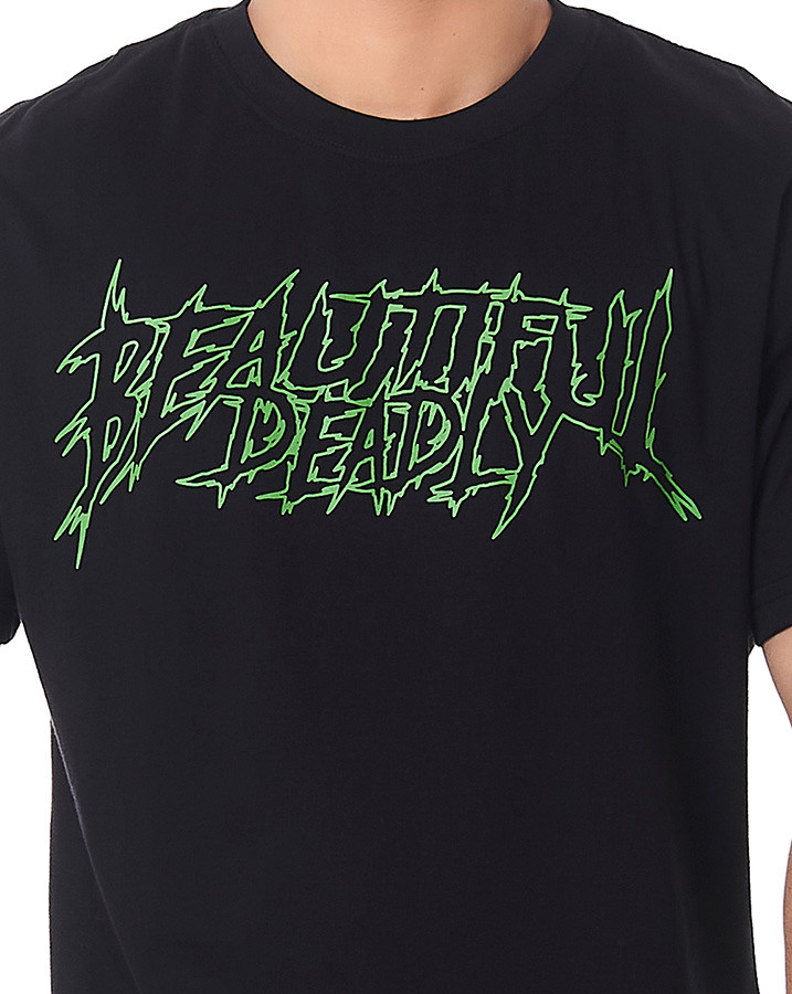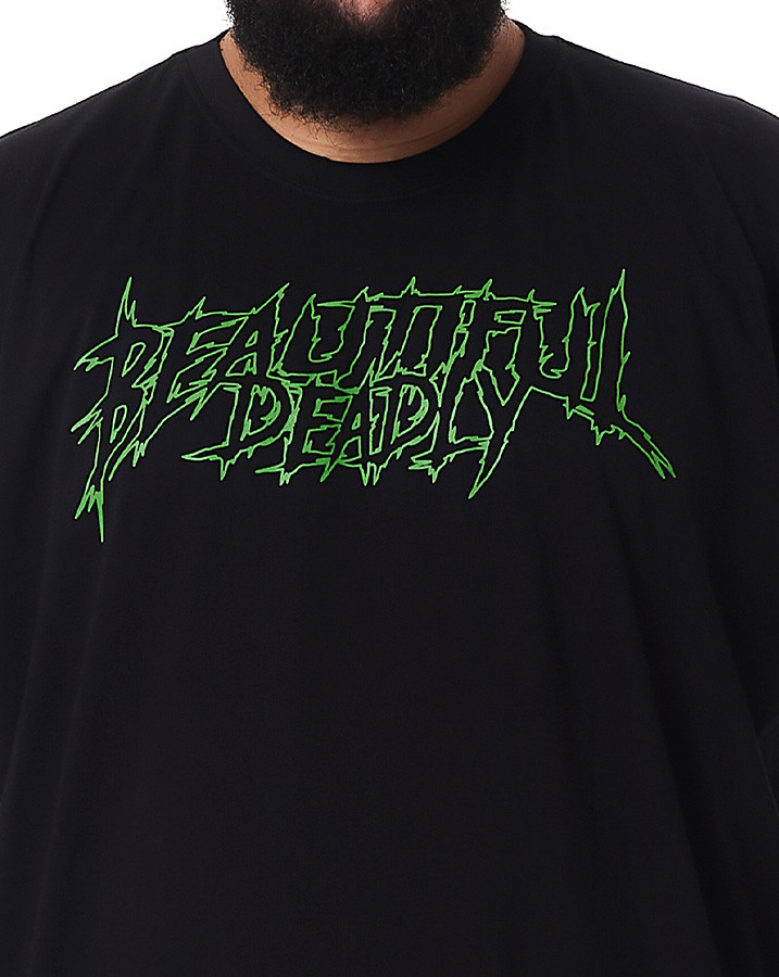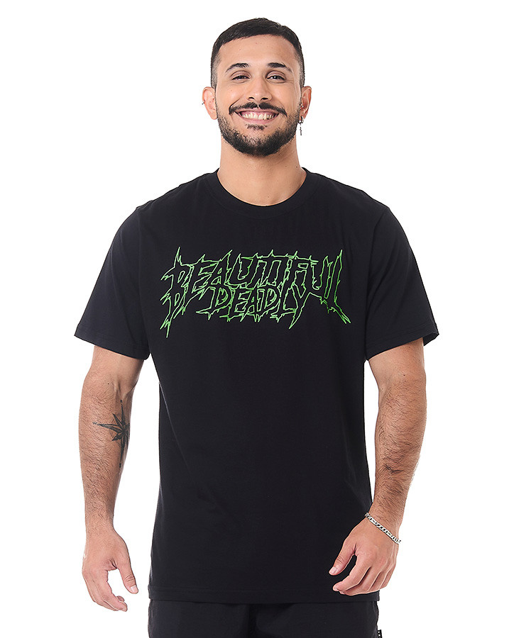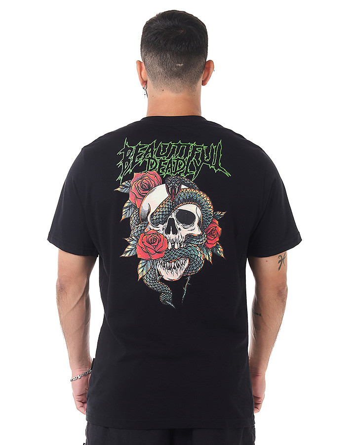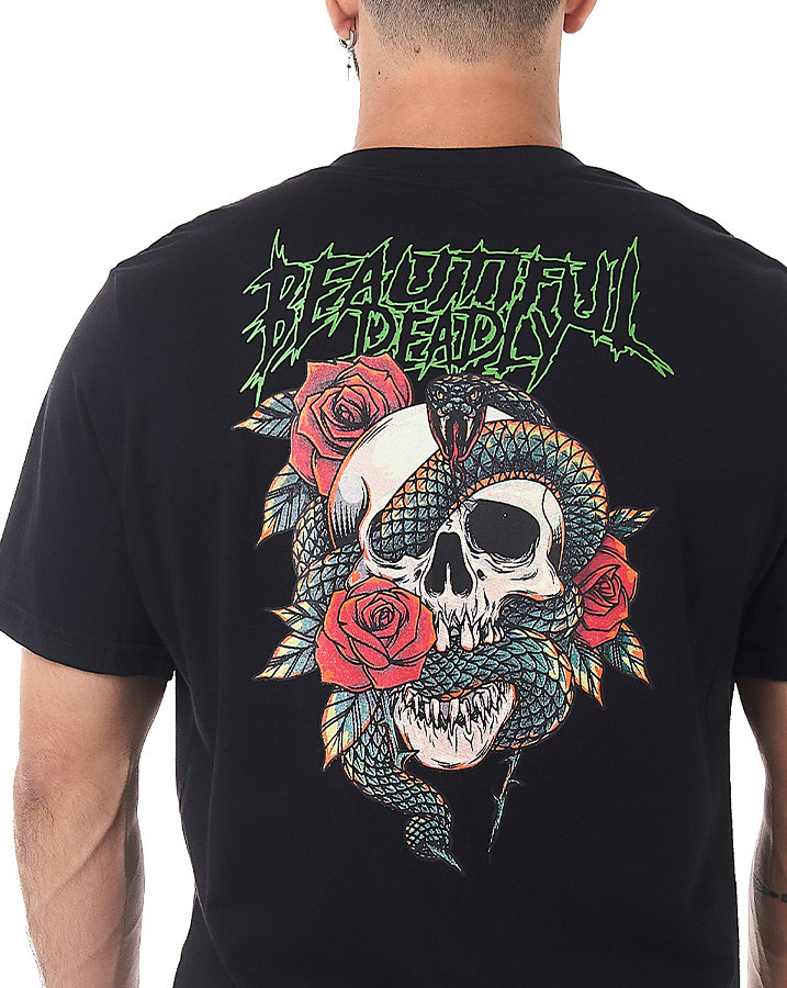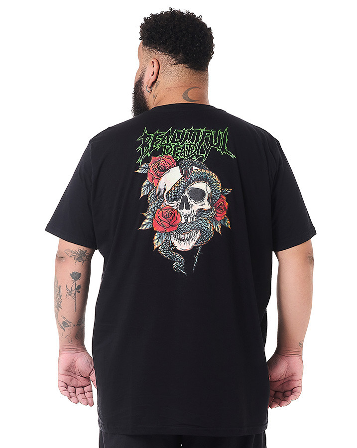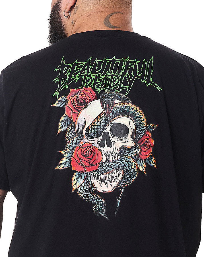 Seu design apresenta uma estampa em silk screen na frente, com a frase "Beautiful Deadly" em verde, enquanto na parte de trás, uma montagem envolvendo uma caveira, uma cobra e rosas cria uma imagem marcante e cheia de significado.