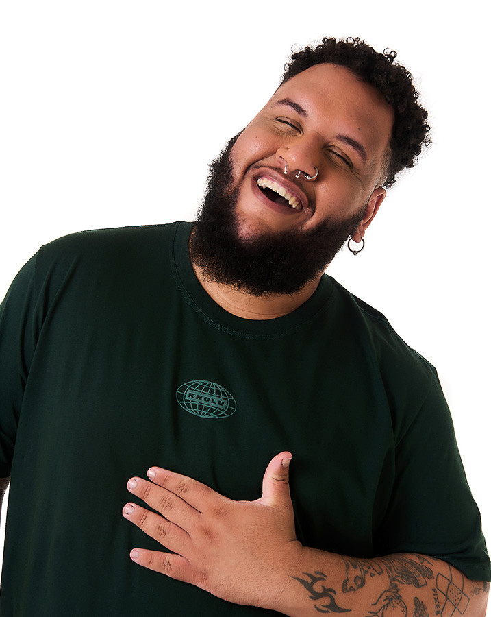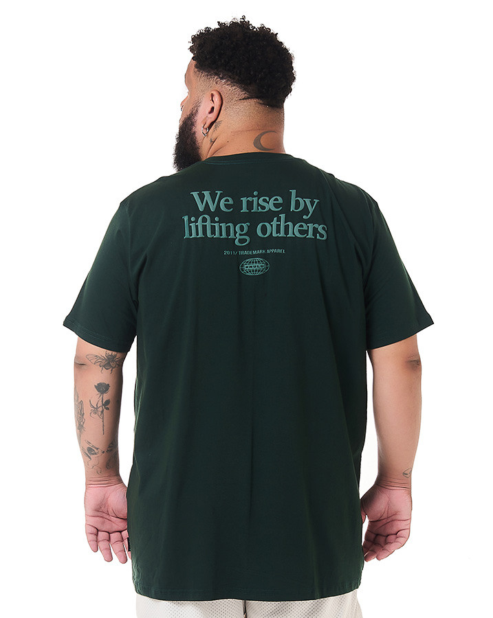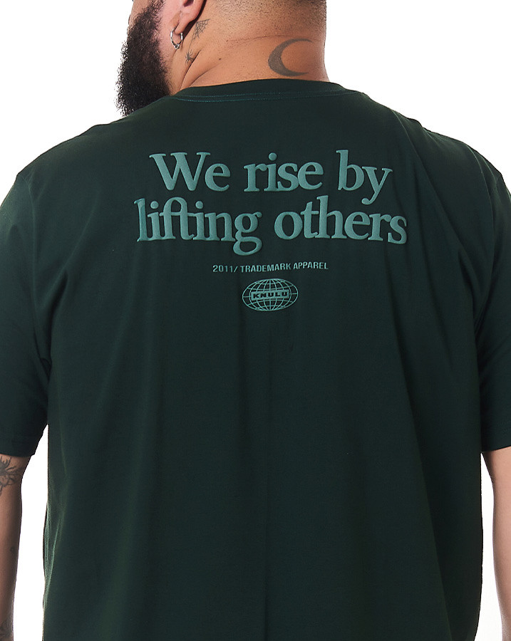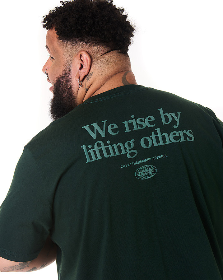Na frente, o distintivo globo da Knulu é um convite para explorar novos horizontes. Nas costas, uma mensagem inspiradora em verde claro, 'we rise by lifting others', reflete a essência de quem busca elevar-se e elevar os outros.