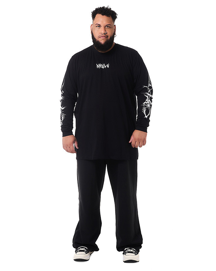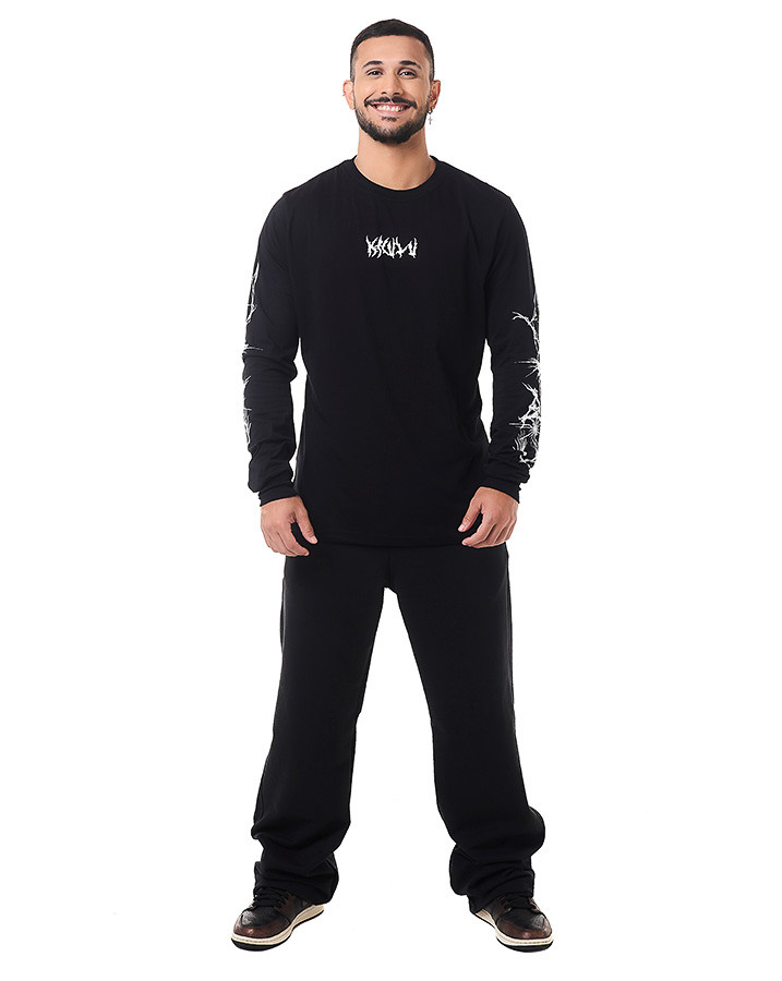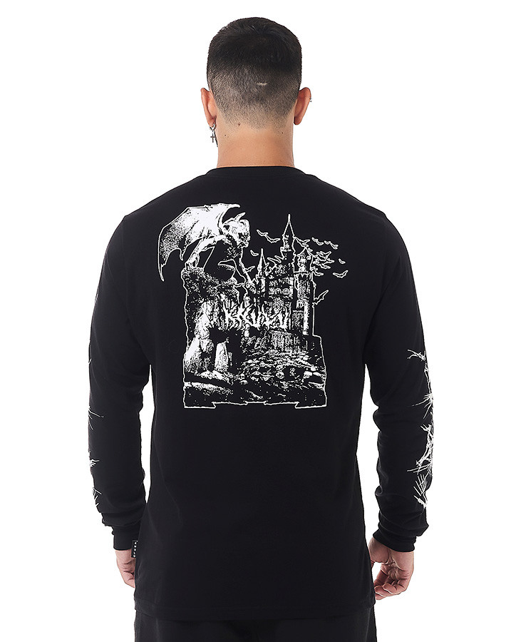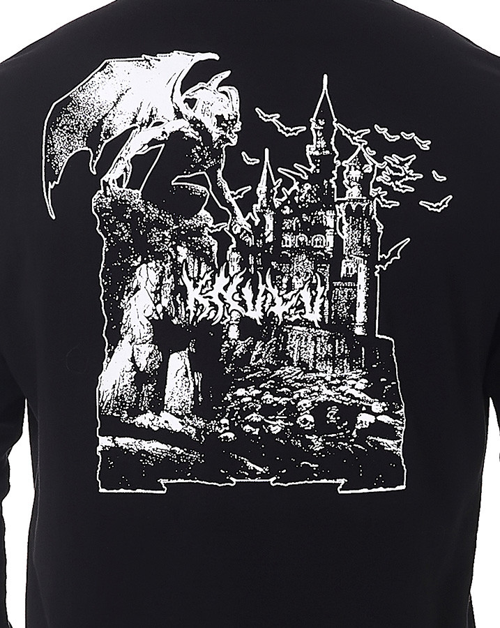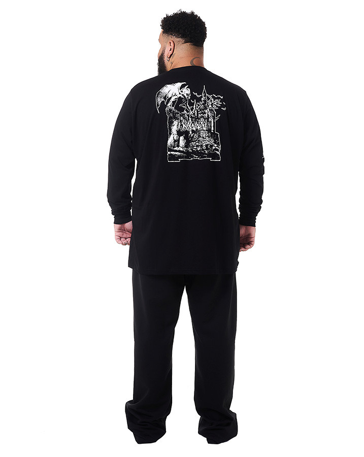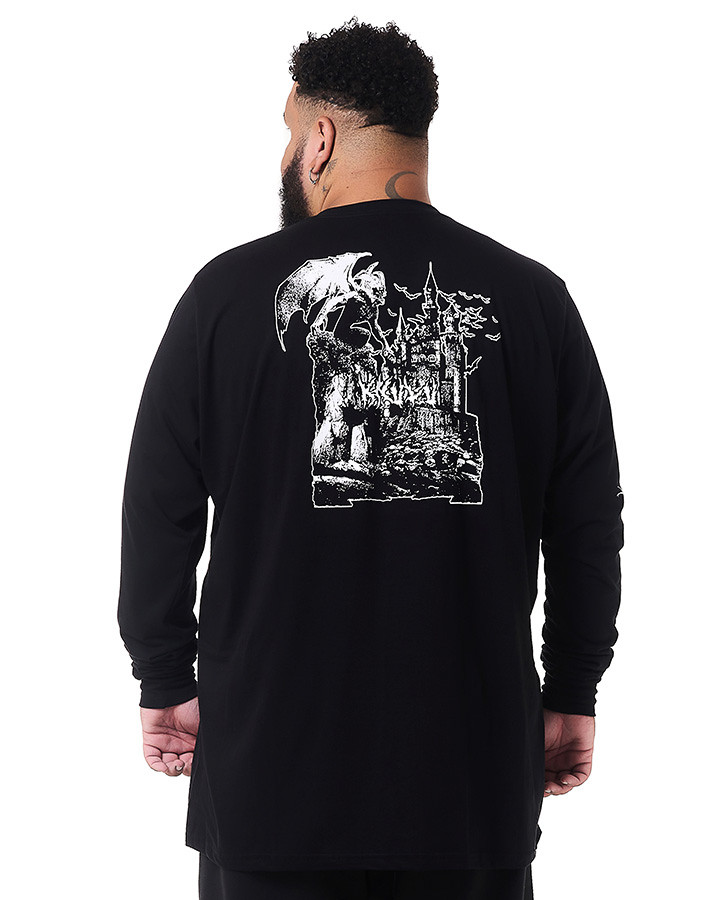 Destacando-se na frente, a estampa em silk screen em branco apresenta um knulu estilizado, adicionando um toque de personalidade ao visual. Nas mangas, linhas abstratas que lembram várias teias criam um visual único e intrigante. Nas costas, um silk de um castelo em um morro com pássaros no fundo e uma gárgula no canto direito acrescenta um toque de mistério e sofisticação.