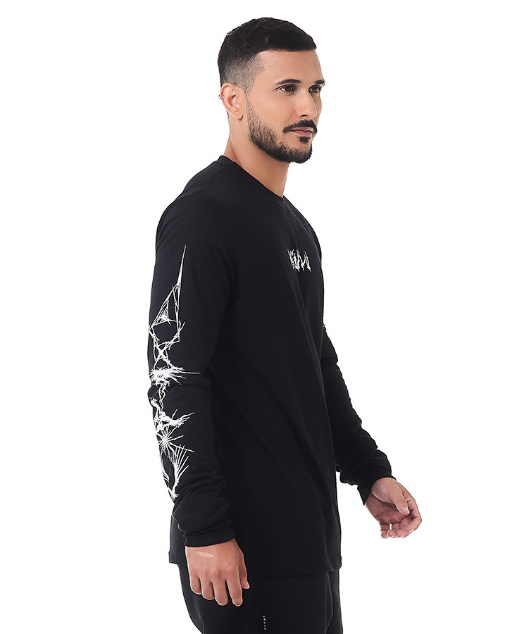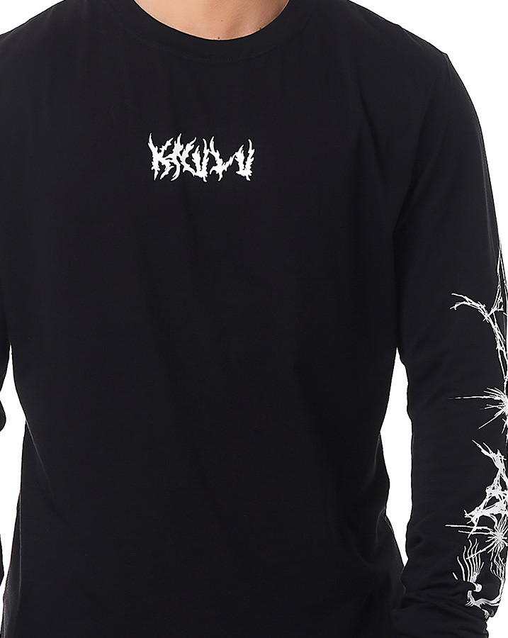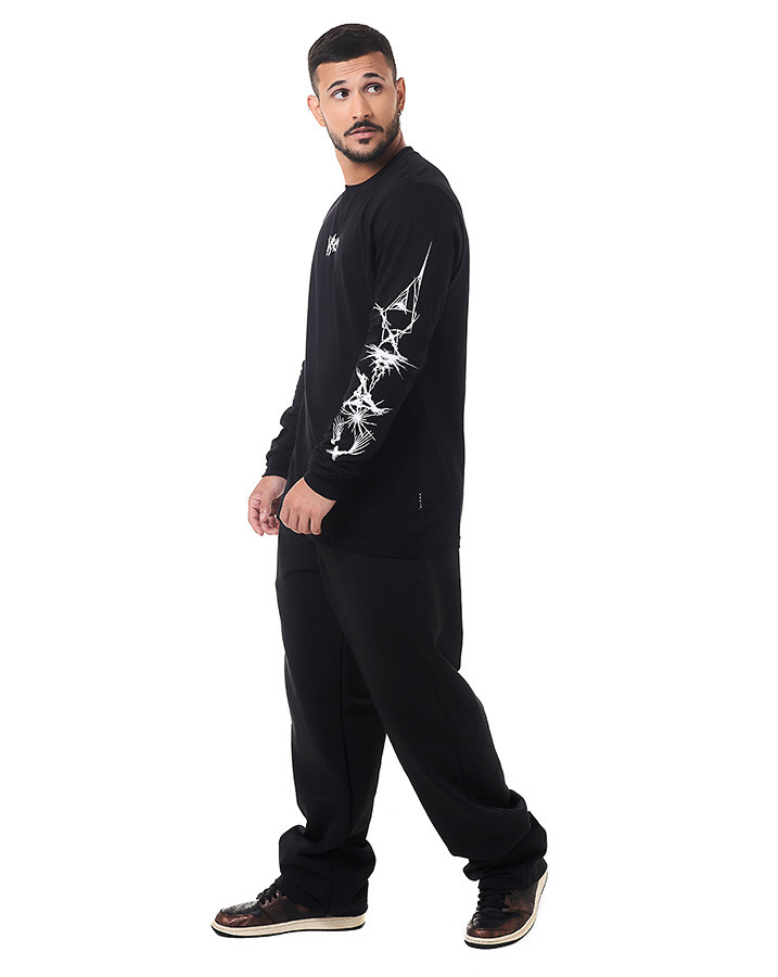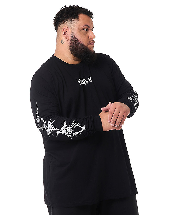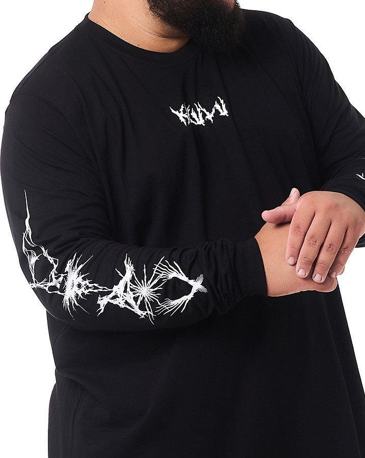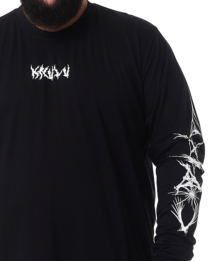 Destacando-se na frente, a estampa em silk screen em branco apresenta um knulu estilizado, adicionando um toque de personalidade ao visual. Nas mangas, linhas abstratas que lembram várias teias criam um visual único e intrigante. Nas costas, um silk de um castelo em um morro com pássaros no fundo e uma gárgula no canto direito acrescenta um toque de mistério e sofisticação.
