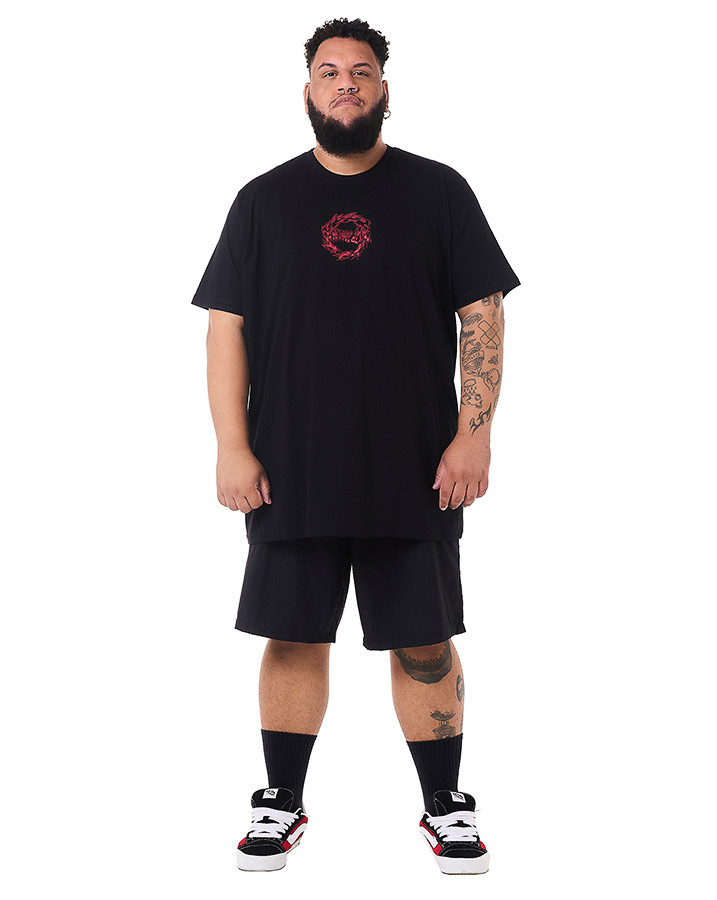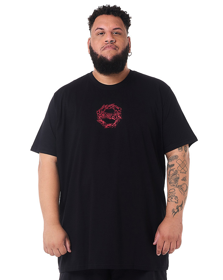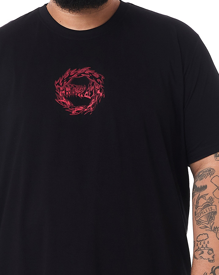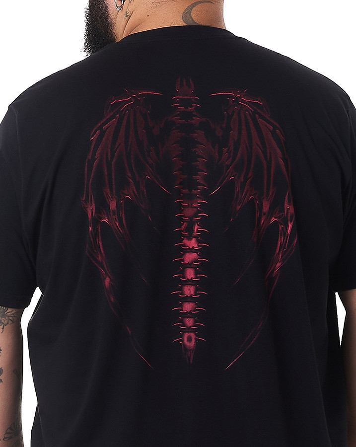 O preto intenso da malha 100% algodão cria uma base ideal para a estampa ousada nas costas: uma asa vermelha, simbolizando liberdade e força.