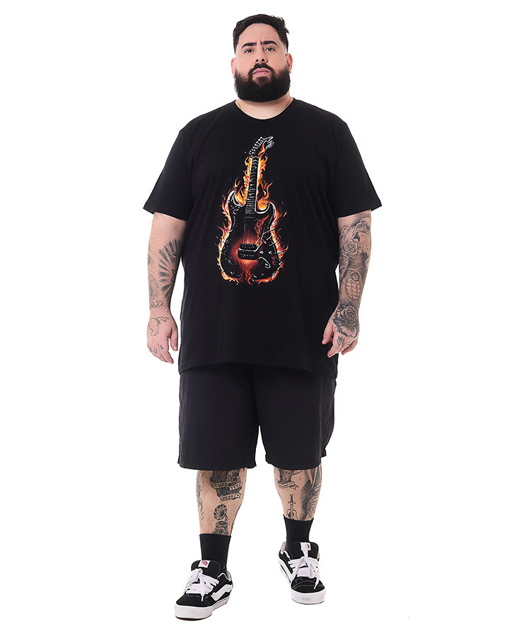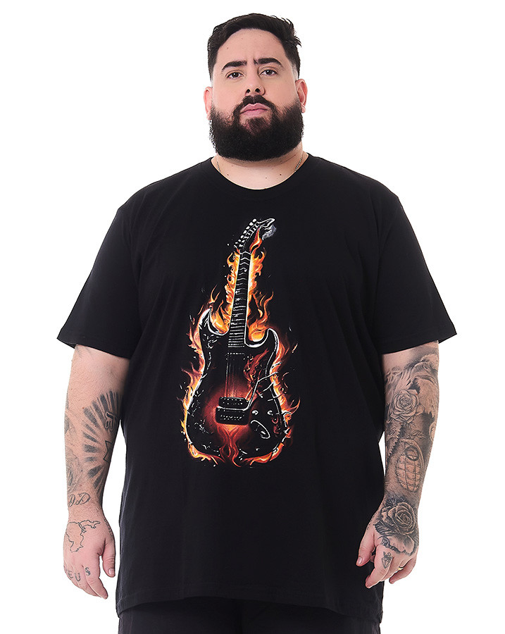 O corte tradicional desta camiseta proporciona um ajuste confortável e atemporal, perfeito para quem aprecia peças que nunca saem de moda. A estampa em silk screen na frente apresenta uma guitarra pegando fogo, capturando a energia e a paixão da música de maneira vibrante e expressiva.