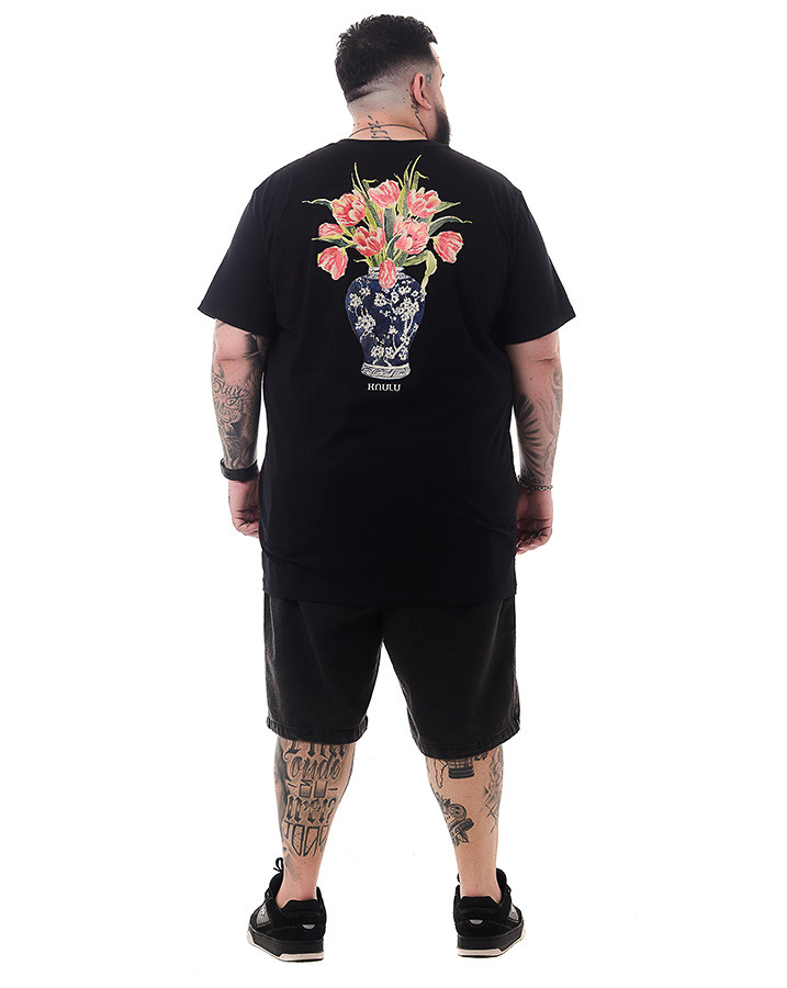 A Camiseta Classic Flower Vase Preto Knulu combina elegância e criatividade em uma proposta contemporânea. O destaque fica por conta da estampa nas costas, com ilustração de um vaso cerâmico ornamentado por flores em tons vibrantes, contrastando com o fundo preto da peça.