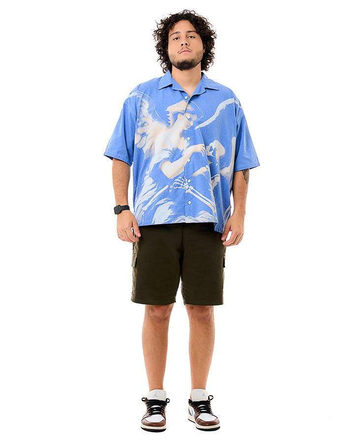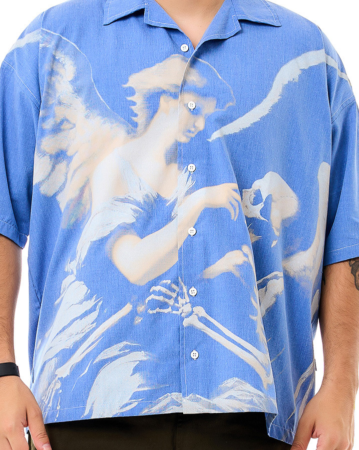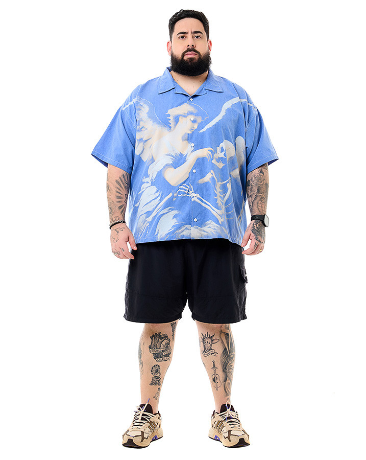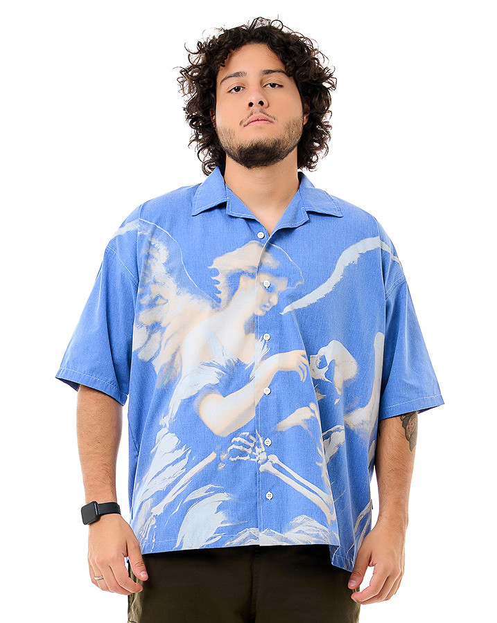 A estampa artística em tons de branco e bege mostra um anjo e um esqueleto, criando um visual marcante que contrasta com o azul jeans. Adicione ao seu guarda-roupa essa camisa exclusiva e expresse sua personalidade com estilo único.