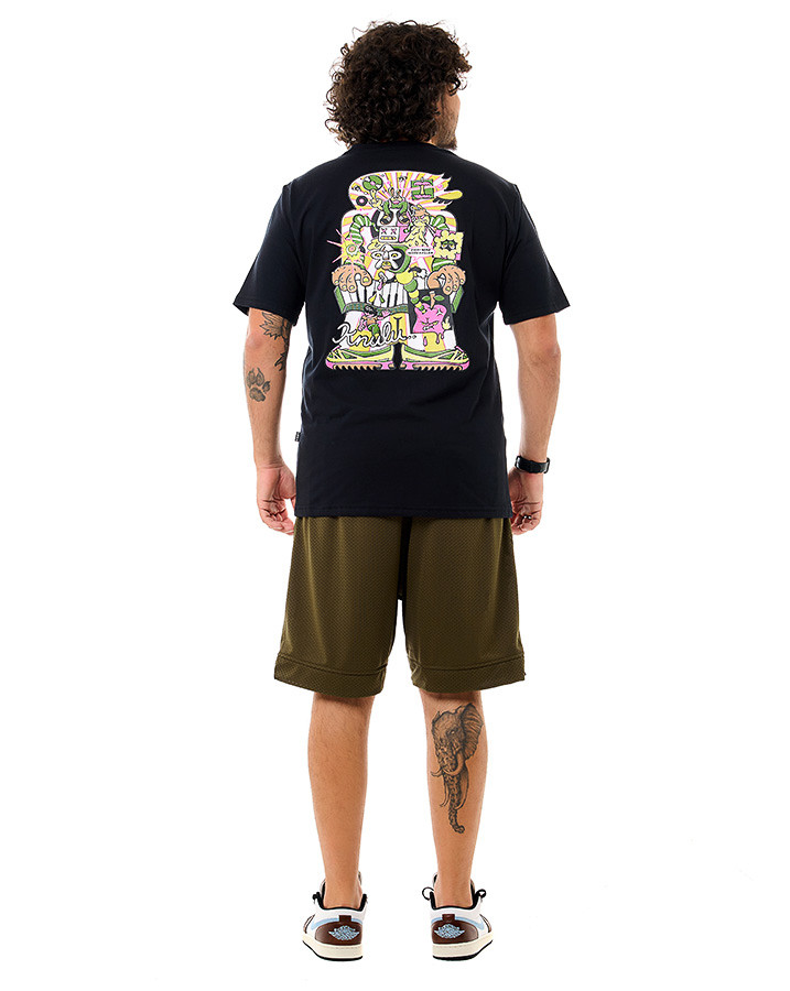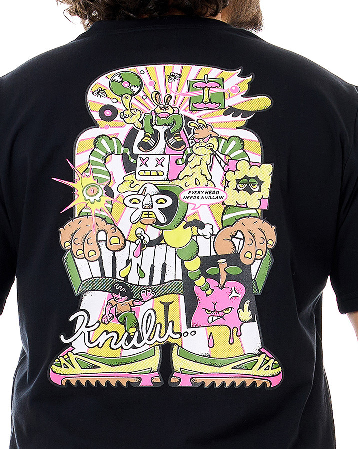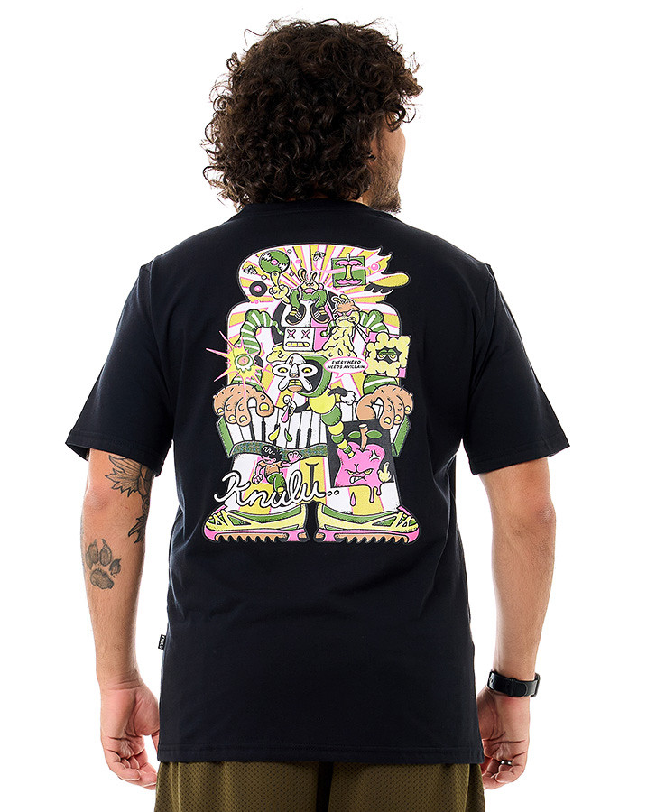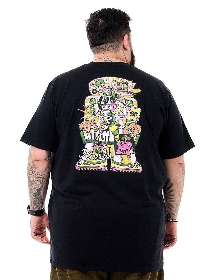 A malha leve e resistente proporciona conforto ao toque e durabilidade no uso cotidiano. O destaque vai para a estampa nas costas, que apresenta uma ilustração multicolorida com personagens e elementos urbanos, assinada com o logo Knulu em traço estilizado. Na parte frontal, o mesmo conceito aparece de forma reduzida, mantendo a identidade visual da peça.
