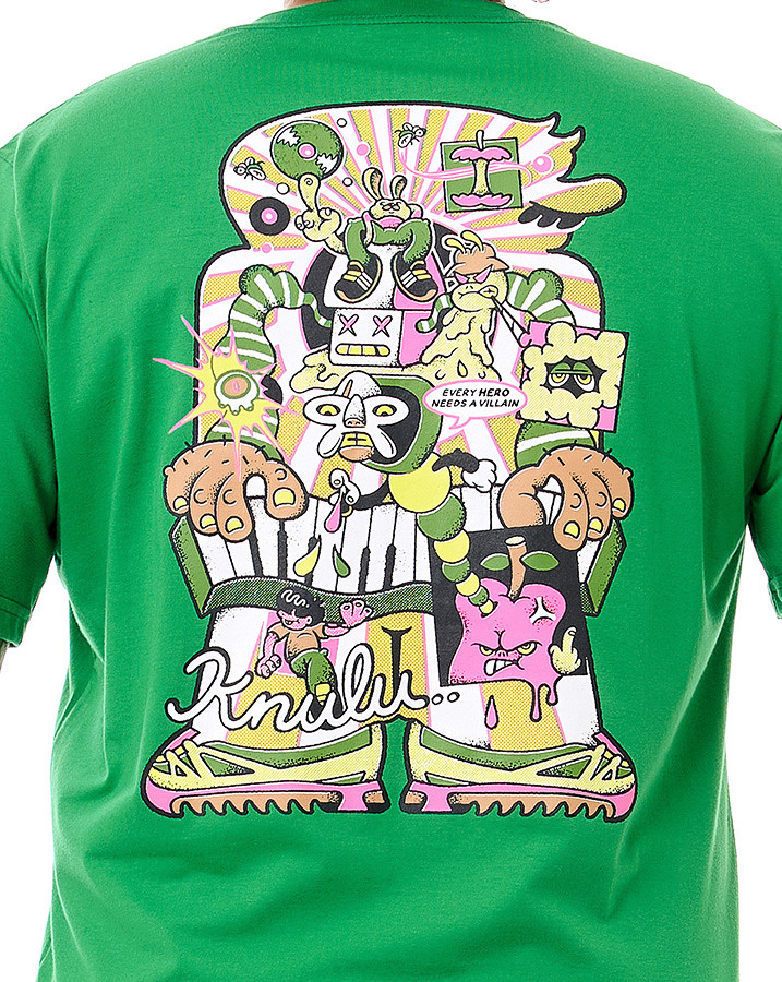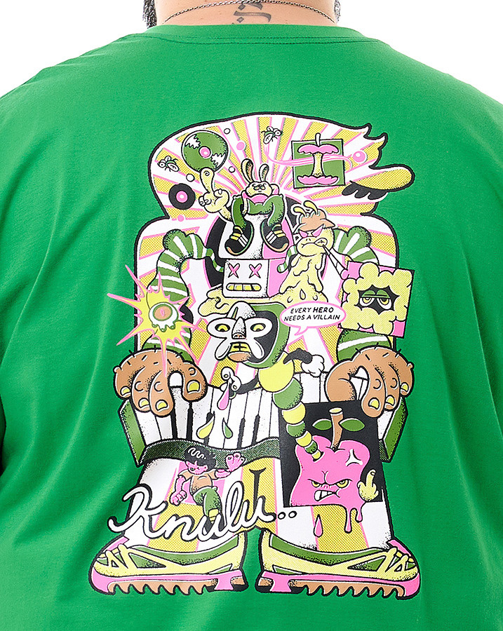 A peça apresenta uma estampa vibrante nas costas com ilustração em estilo cartoon e a frase "EVERY HERO NEEDS A VILLAIN", adicionando um toque de originalidade. As cores intensas contrastam com o fundo preto, criando um visual marcante. A etiqueta discreta com "Knulu" reforça a autenticidade.