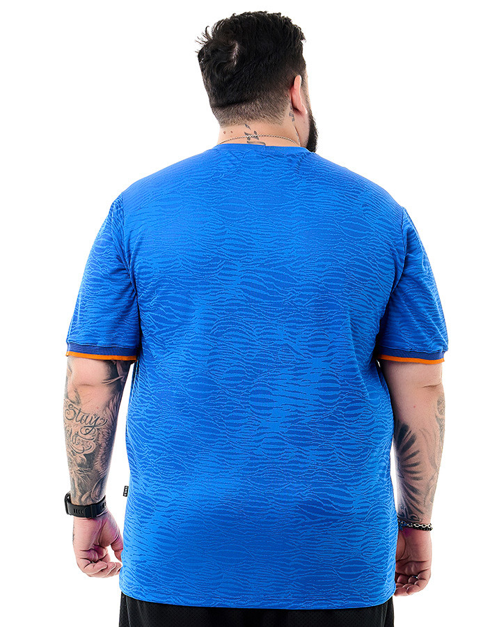A Camiseta Dry-Fit Jacquard Lion Azul Royal Knulu, confeccionada em Dryfit 100% poliéster, apresenta tecido jacquard com padronagem texturizada e modelagem regular para um visual moderno. Destaca-se pelo escudo termocolante "KNULU" com leão alaranjado, gola e mangas em ribana com detalhe laranja e costuras reforçadas. Uma peça que une design marcante e atenção aos detalhes.