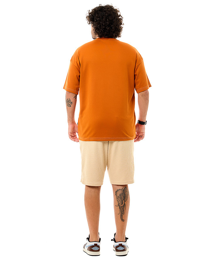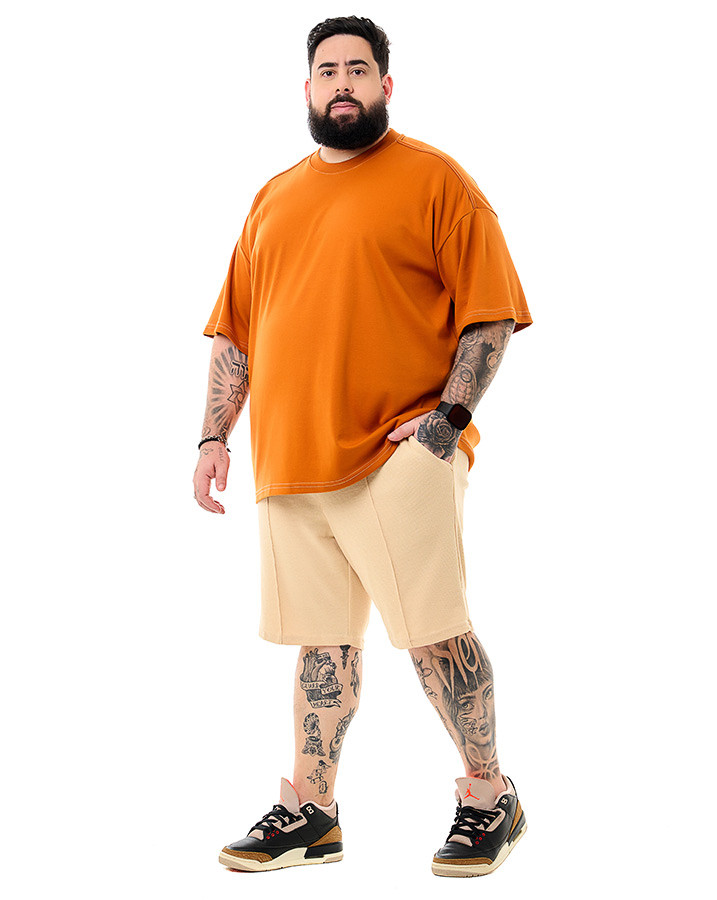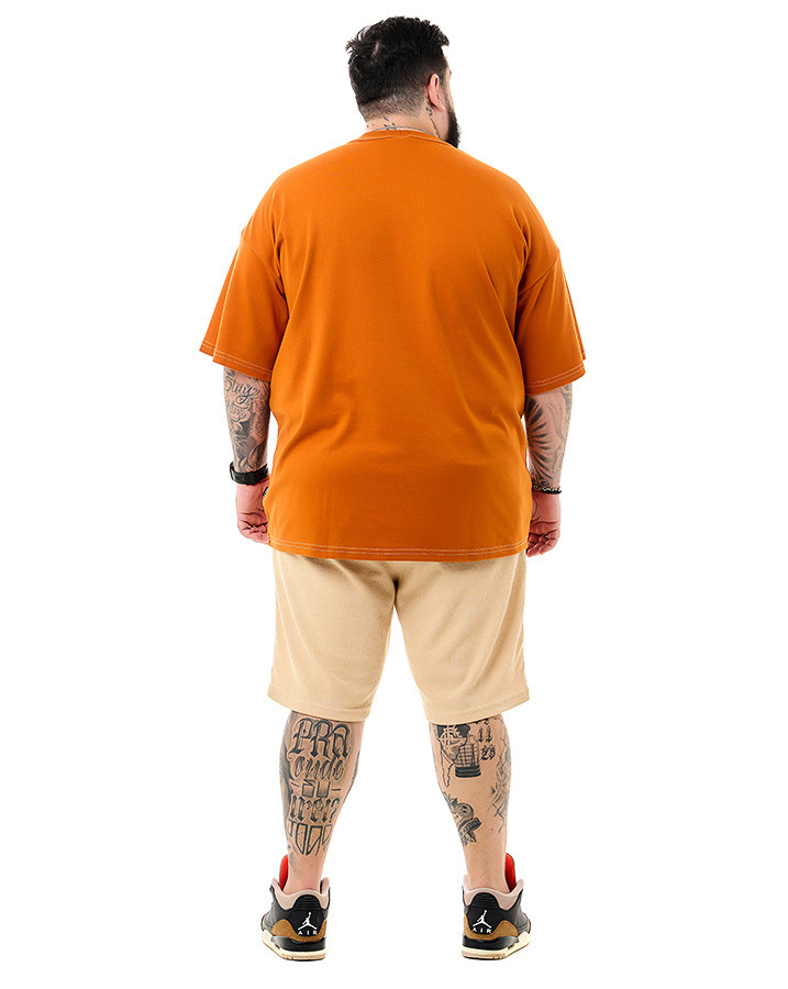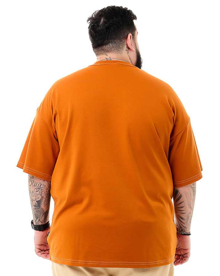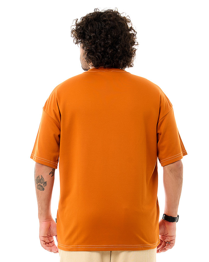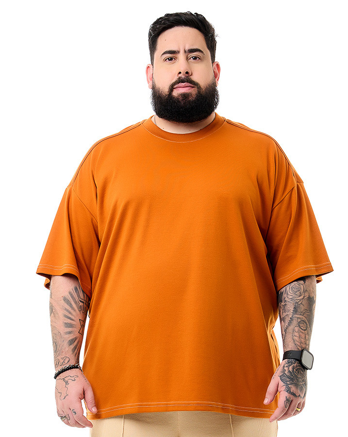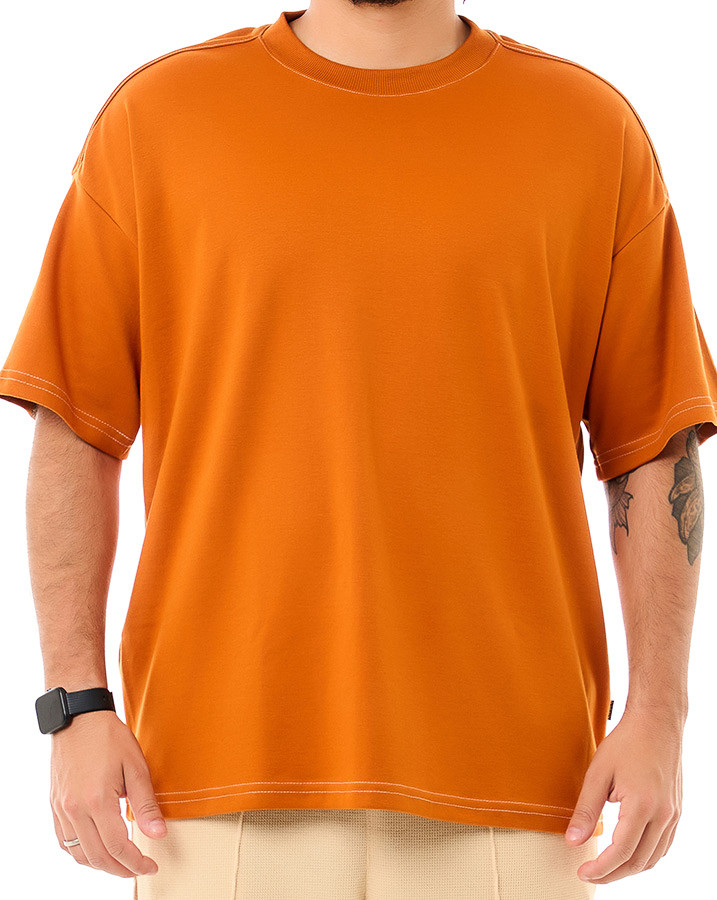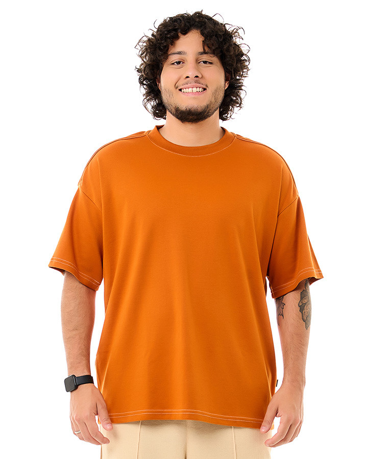 Camiseta Oversized Boxy Shoulder Line Ferrugem Knulu: Conforto e estilo em uma só peça. Feita em malha premium de fio penteado 30.1 (50% algodão, 50% poliéster), esta camiseta na cor ferrugem destaca-se pelas costuras contrastantes em branco na gola, mangas, ombros e barra.