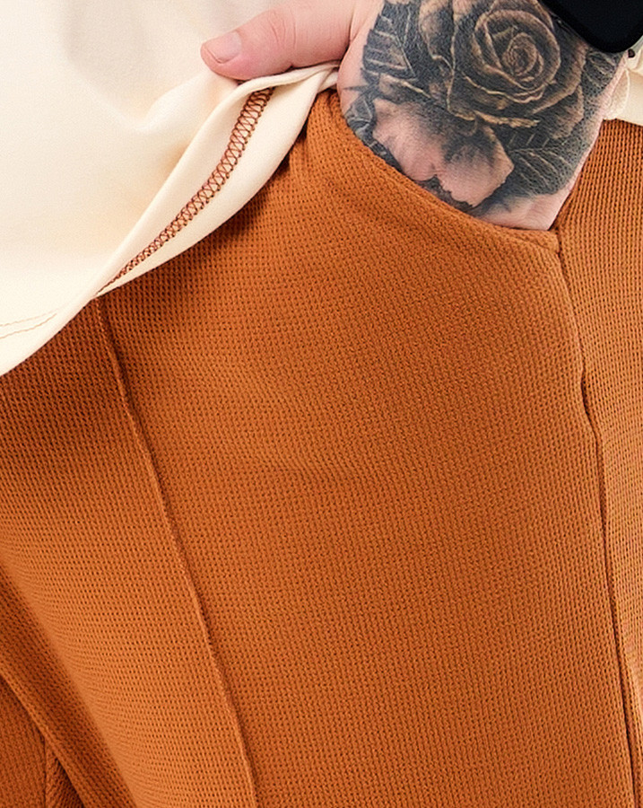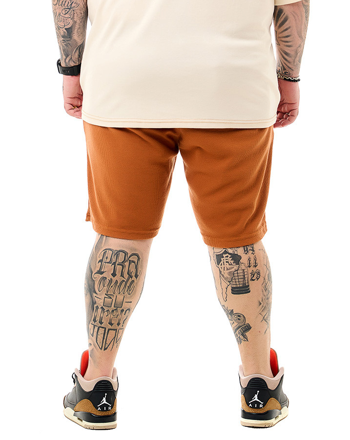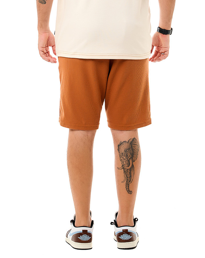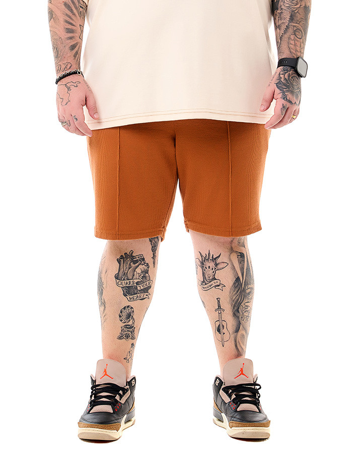 Bermuda Casual Malha Textura Square Nervura Terra Cota Knulu: Conforto e elegância em uma só peça. Feita em Malha Square (50% algodão, 50% poliéster) com textura trabalhada, essa bermuda terra cota oferece um toque sofisticado ao visual. Com corte reto acima do joelho, cintura ajustável com elástico e cordão, e três bolsos – dois laterais e um traseiro embutido –, ela garante movimentos livres e ajuste perfeito.
