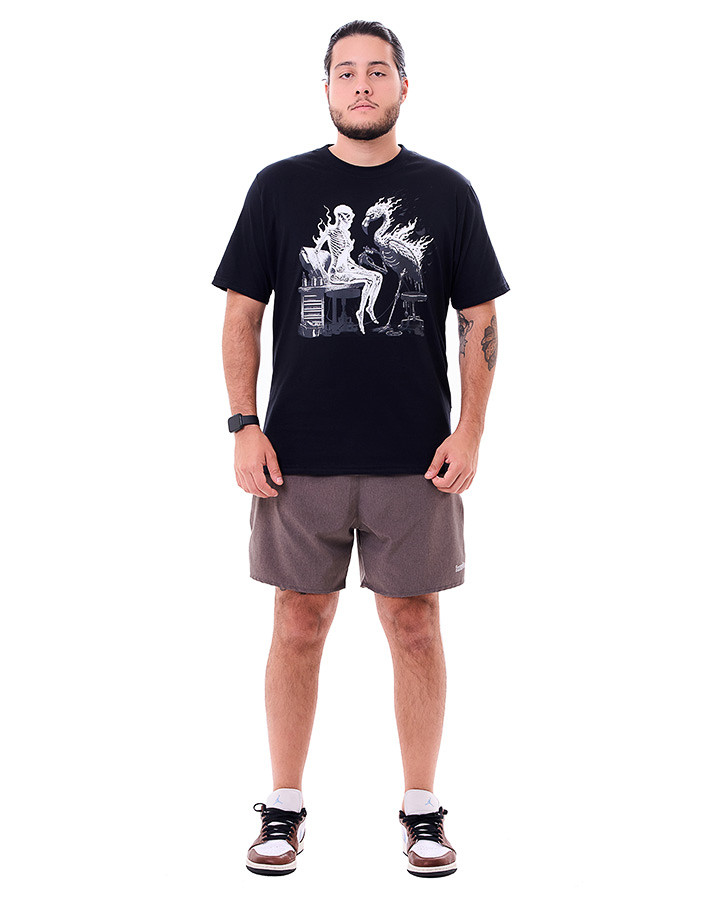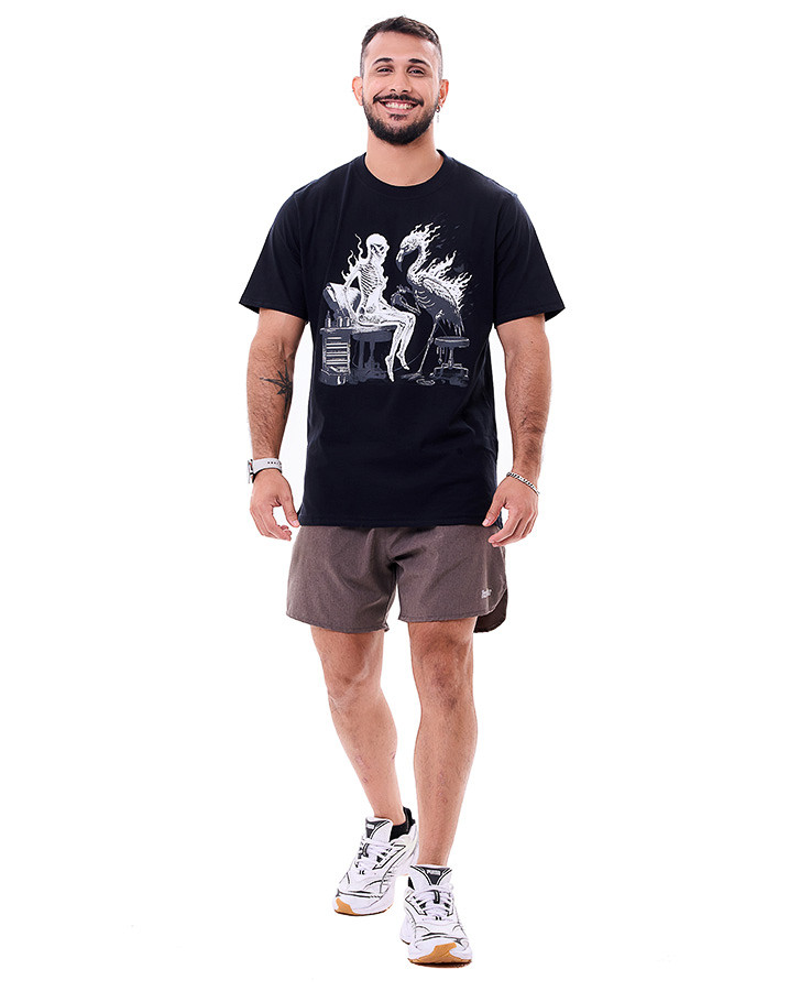 A Camiseta Classic Flamingo Tattoo Preto Knulu entrega uma proposta ousada e cheia de personalidade, com arte gráfica exclusiva que retrata um flamingo tatuador e uma figura esquelética, em uma composição que mistura humor ácido e estética urbana.