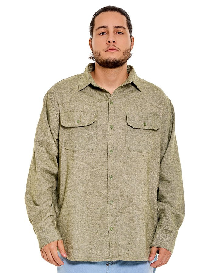 O tecido flanelado tem textura macia e toque encorpado, oferecendo sensação de aconchego e boa cobertura térmica para dias amenos. A cor verde acinzentada traz uma proposta neutra, versátil e alinhada com a paleta da estação.