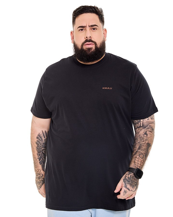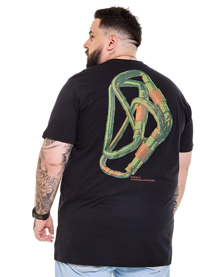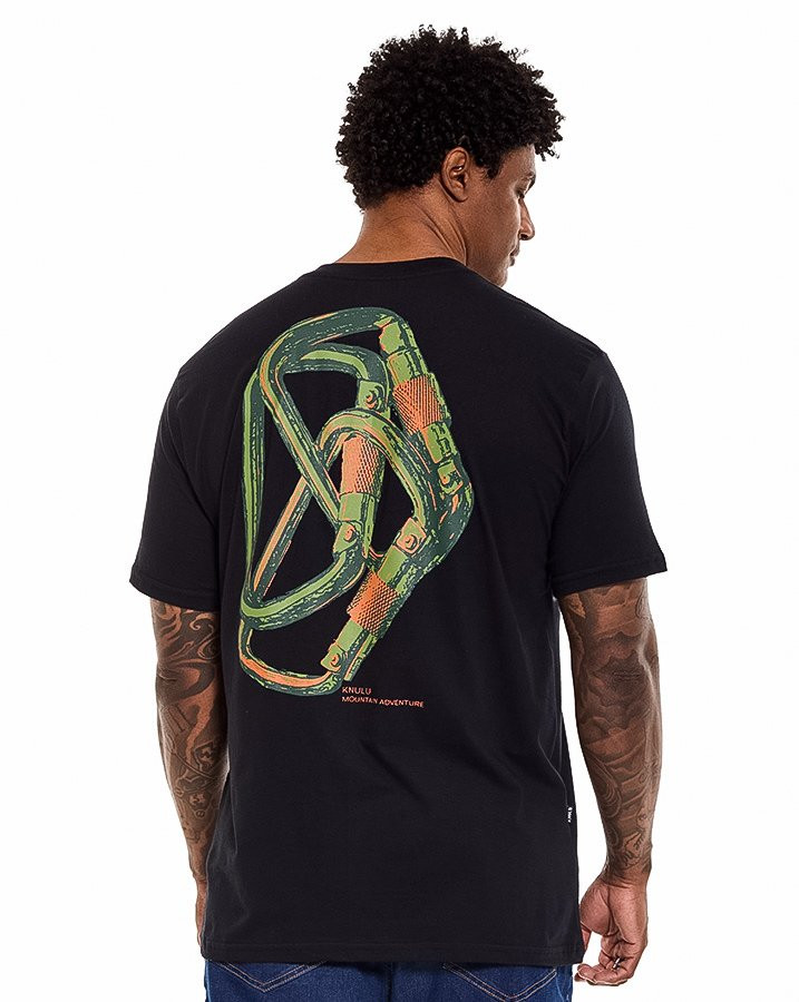 A Camiseta Classic Carabiner Clip Preto Knulu traz um visual marcante com inspiração no universo da escalada, integrando a proposta da coleção Explorer. O destaque fica para a estampa nas costas, que apresenta ilustração em silk screen de mosquetões sobrepostos em cores contrastantes, reforçando a estética outdoor da peça.