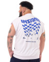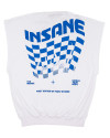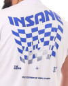 O destaque fica por conta do conjunto de estampas: Nas costas, a estampa central em azul vibrante atrai o olhar para a palavra INSANE em tipografia marcante, acompanhada por um padrão quadriculado que remete a bandeiras esportivas. Frases como "THE INSANE", "W.D TO 20", e "FIRST EDITION OF MANY OTHERS". Na frente, o logo INSANE surge em uma versão reduzida no lado esquerdo do peito.